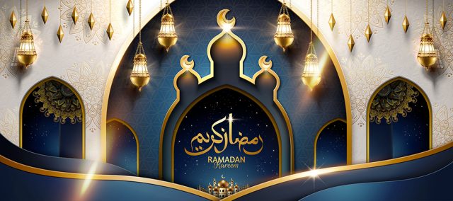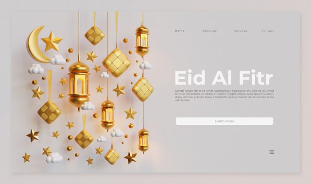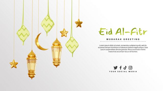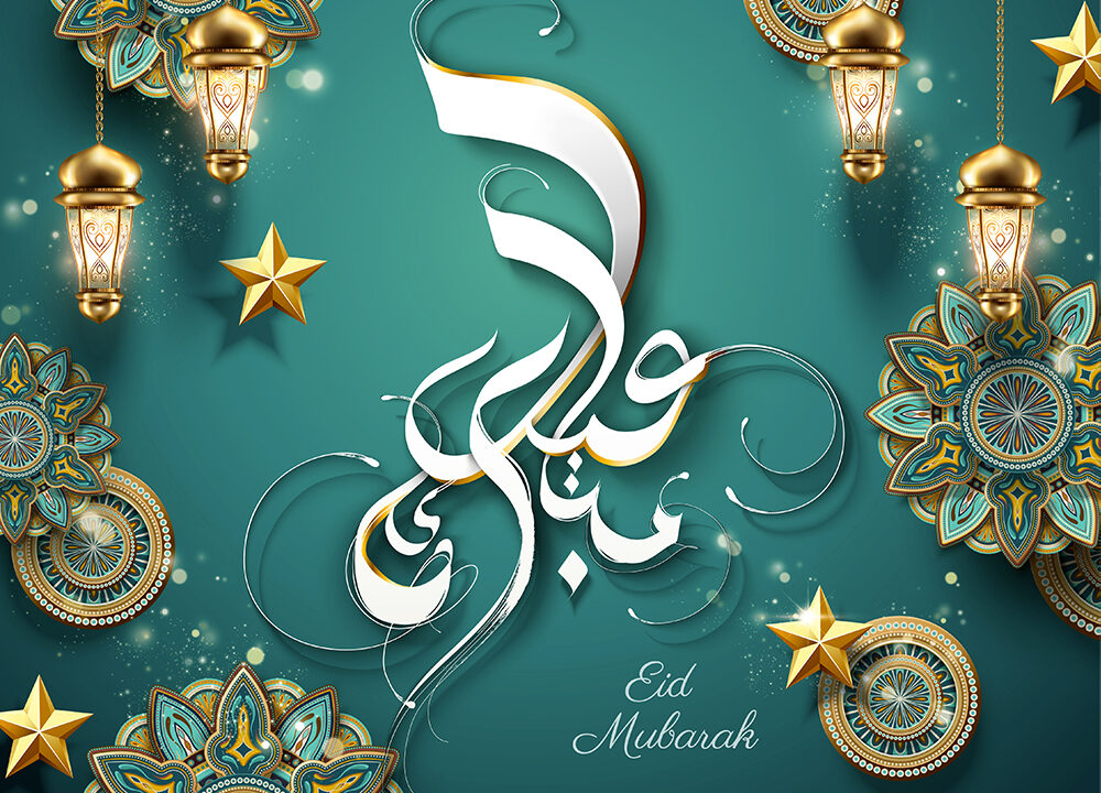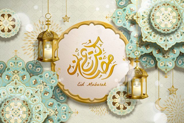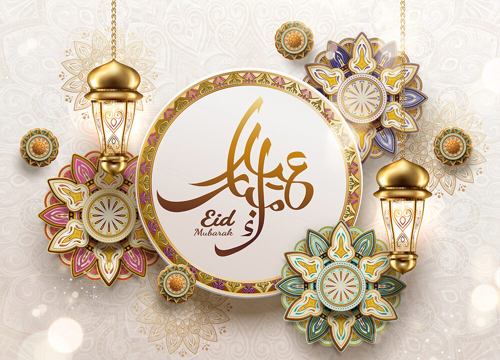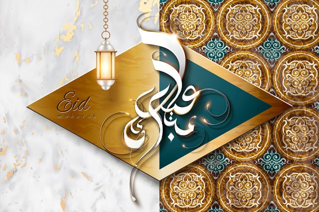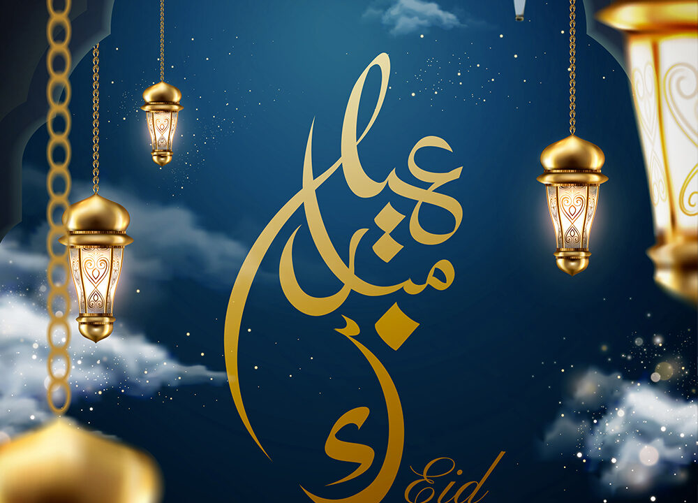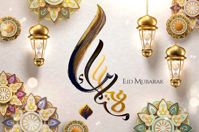 eid mubarak golden calligraphy with purple arch hanging lanterns decorations happy holiday written arabic