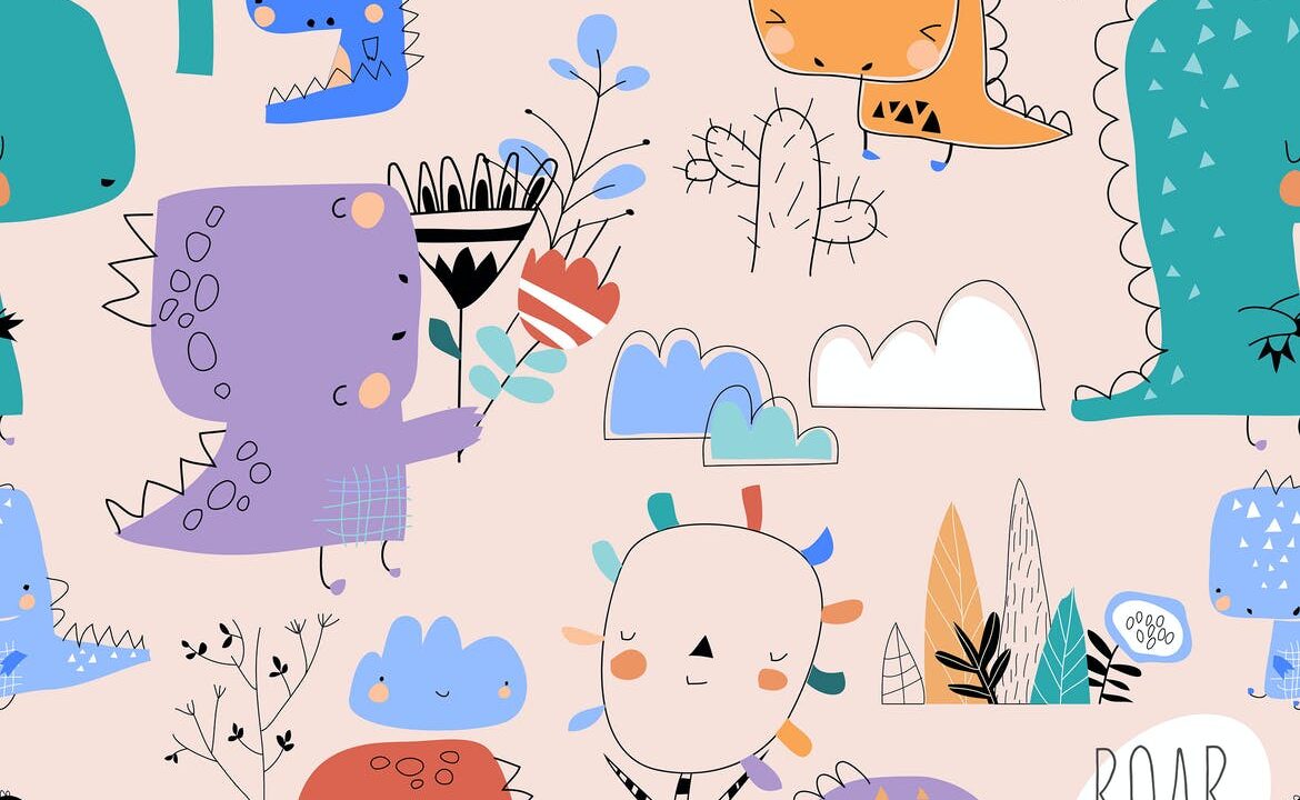 Vector seamless pattern with cute cartoon dinosaur