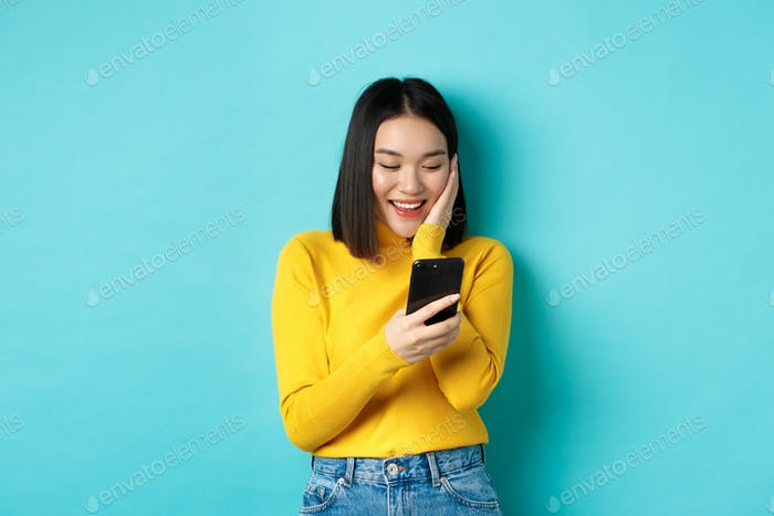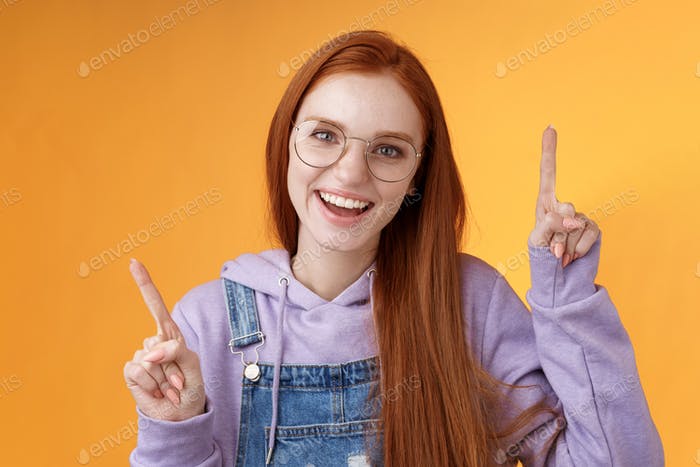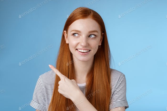 Portrait Of Excited Young Korean Woman Looking At Copy Space With Interest