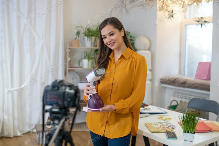 Happy woman making healthy food standing smiling in kitchen preparing food