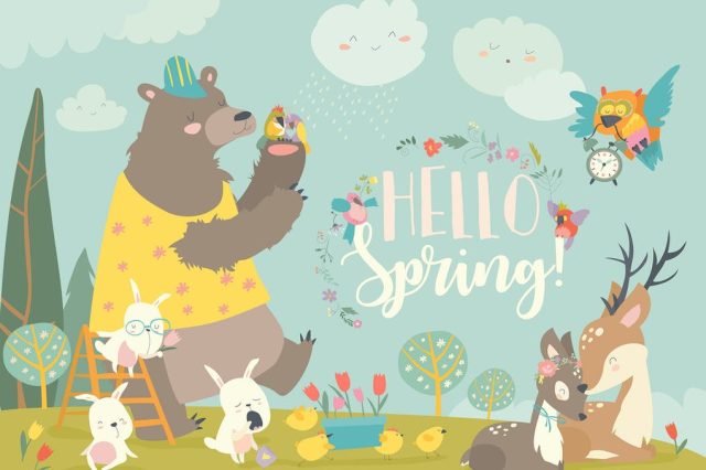 Cute animals meeting spring in the forest Vector