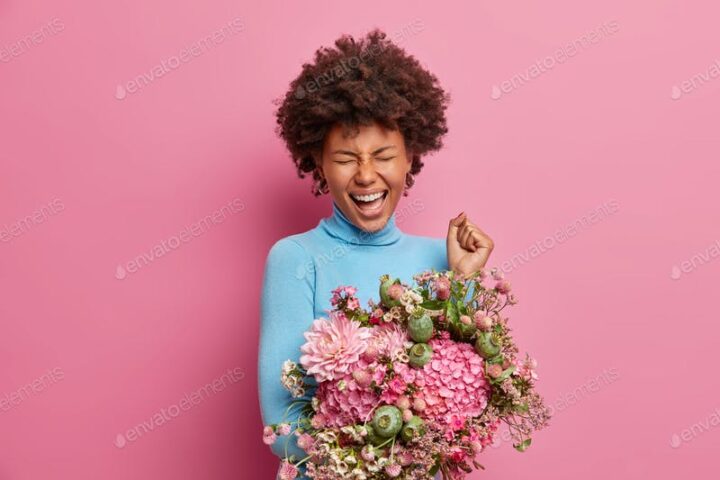 Joyful curly woman with overjoyed face expression broad smile raises clenched fists phones someon