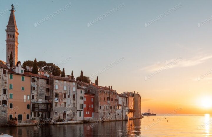 Sunset over ocean behind a picturesque seaside town in Rovinj Croatia