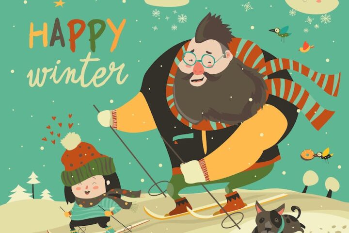 Happy father and daughter skiing in snow.