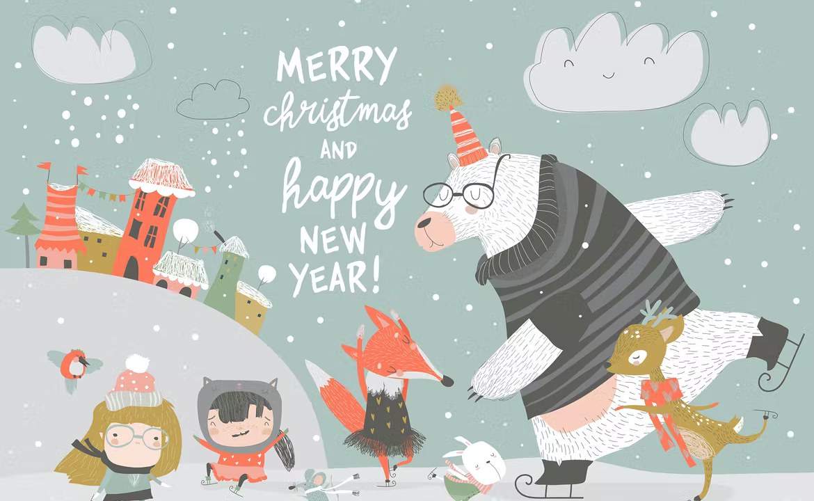 Cute children skating with bear deer and fox