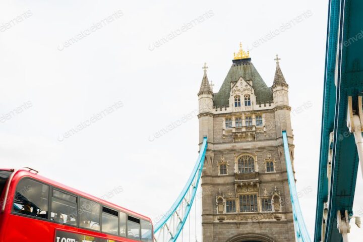 A classic red bus crossing Tower Bridge in London