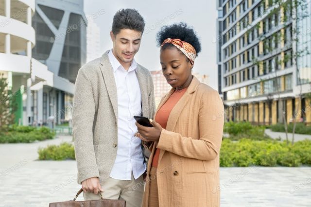 Young African businesswoman showing colleague online news or curious advert