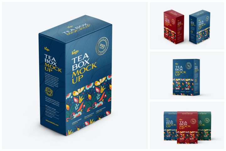 New amazing Tea Box Packaging Mockup Set with 4 scenes, 4k backgrounds, and trendy packaging design. This mockup bundle includes a total of 4 packaging mockups that can use for tea packaging and branding designs.