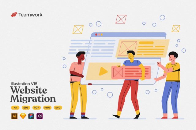 The illustration tell a brief story about teamwork process: A group of team working together, manage website database migration to another platform/ domain/ hosting/ or server.