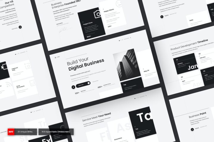 Pptx, Business, Company, Creative, Digital, Startup, Studio, Organization, Project, Innovation, Portfolio, Proposal, Technology, Monochrome, Advertising,