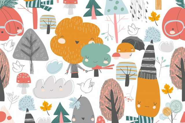 Vector seamless pattern with colorful autumn trees. Cartoon yellow orange autumn tree on white background