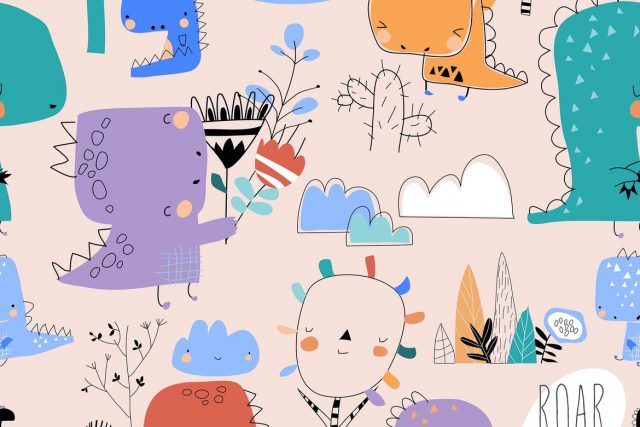 Vector seamless pattern with cute cartoon dinosaurs on pink background