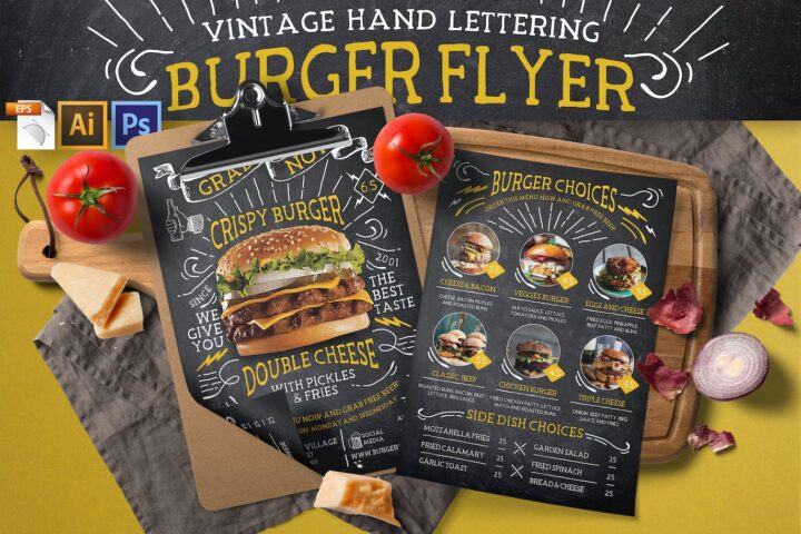 Food, Menu, Burger, Fast food, Hand lettered, Vintage, Blackboard, Poster, Typography, Chalk, Texture, Flyer, Promotion, Restaurant, Gastronomy,
