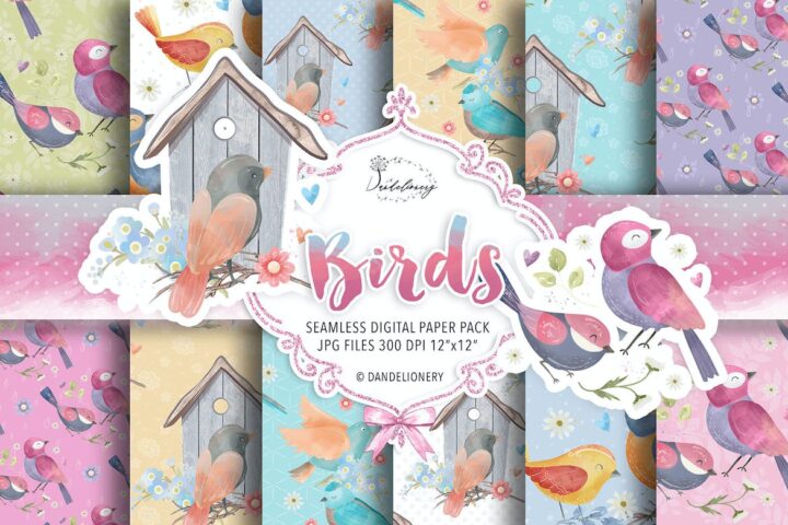 Watercolor Birds digital paper pack, Spring pattern, Flower background, Hand Drawn Flowers, heart, spring, floral, pink, color, bird pattern