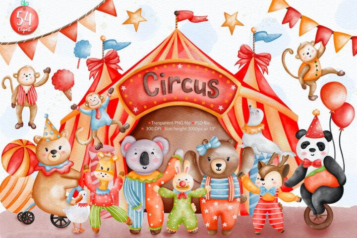 Watercolor Circus Animal | Circus Decor : All images are Digital hand painted by watercolor in PNG format with high resolution (300 dpi) with a transparent background