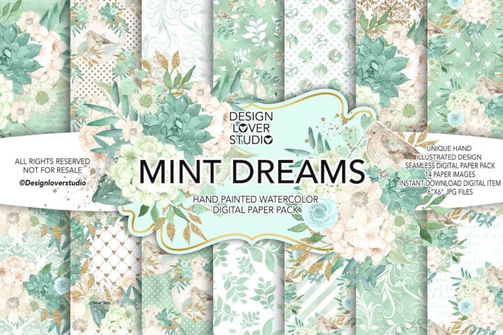 Watercolor, Mint, Flower, Succulent, Green, Seamless, Pattern, Digital, Paper, Wedding, Floral, Leaf, Hydrangea, Roses, Leaves,