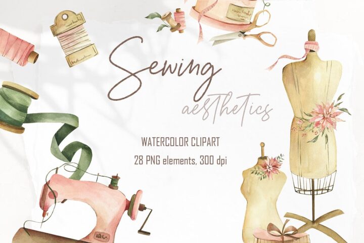Watercolor Sewing aesthetic set: sewing machine, tools, sew compositions, scissors, needle, stitching. Hand painted Sewing elements. Unique collection in watercolor for design. Perfect for cards, stickers, invitations, stationery, greeting cards and more. This is DIGITAL product.