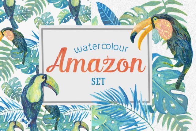The set of high quality hand painted watercolor tropical leaves and elements images in bright and fresh color palette. Included 4 seamless patterns 9 isolated object, 2 set.