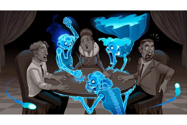 We Are Not Dead. Cartoon representation of a seance. Vector illustration.