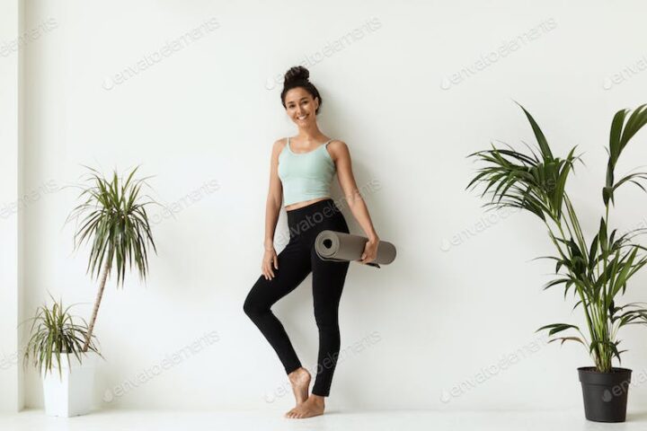 Yoga Coach. Beautiful Smiling Woman Holding Fitness Mat Posing Near White Wall