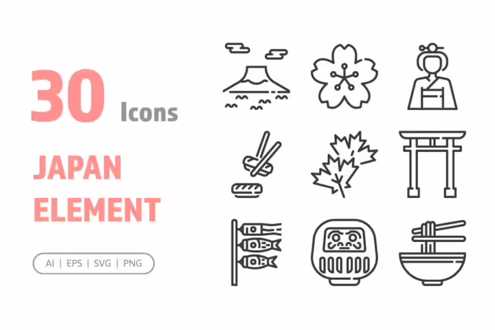 This set contains 30 Japan Element Icons with high quality. All vector icon is pixel perfect and base on 64px grid.