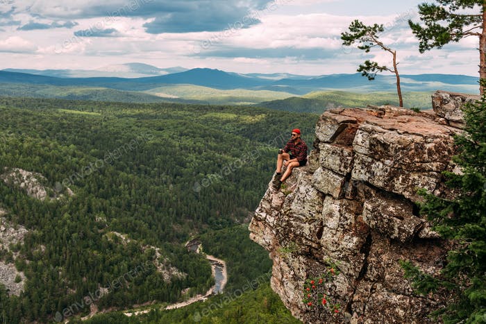 A male traveler is sitting on a rock with a bird’s-eye view of the forest. The concept of recreation and tourism. A man traveler sitting on the edge of a cliff. A man enjoys beautiful views. Travel