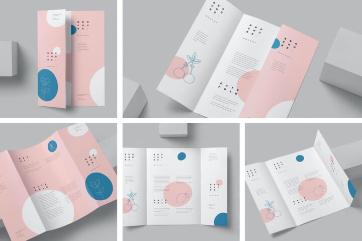 A4 gate fold brochure mockups in 5 different views and angles to showcase your promotional designs and print ads. These mockups allow you to customize the shadows and light effects using intelligent layers. Just use this brochure to present your designs and you will be amazed by the reaction from your clients.