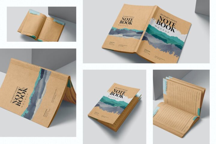 Perfectly crafted A6 kraft paper notebook mockups offering customizable book covers and inner pages. Offering separate smart object options on each visible part of the kraft paper book. These mockups have well-organized layers for the customization of light effects, shadows and background.
