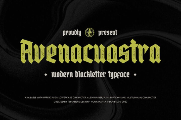 AVENACUASTRA is a fairly simple Blackletter font, not too many strokes or ornaments. The font is clean enough so that it has better legibility than other Blackletters. Even so, this font still has a vintage style so it is suitable for creating classic or retro designs, such as for liquor branding, studio tattoos or classic motorcycles.