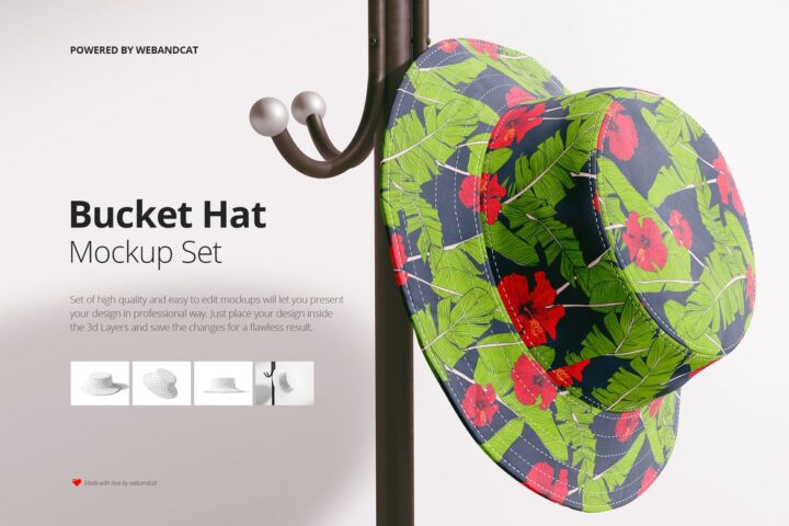 Set of 4 high quality and easy to edit 3d Bucket Hat mockup’s will let you present your hat design in professional way. Just place your design inside the 3d layer and save the changes for a flawless result.