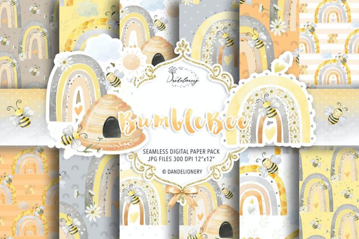 Watercolor Bumble bee digital paper pack, Ladybug, Rainbow, bee, leaves, honey, heart, cute, flower, nursery, seamless