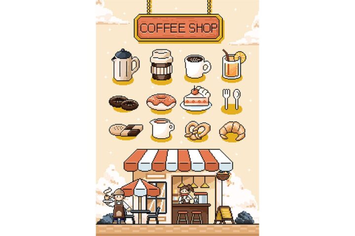 Cafe, Food, Drink, Pixel, Art, Game, Coffee, Bread, Cake, Donut, Juice, Cookie, Biscuit, Shop, Barista,