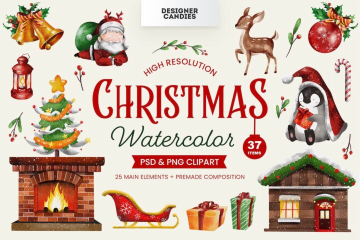 This collection of Watercolor Christmas Illustrations contains all the clipart elements you’ll need for wonderfully warm & whimsical Christmas designs.