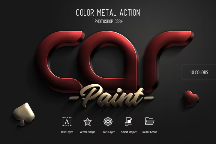 One click action. Photoshop ver. CS3 CS4 CS5 CS6 CC CC2014 CC2015 CC2015.5 CC2017 CC2018 Professional multifunctional Photoshop action transforms your text, vector shape, pixel layer, smart object, layer group into Color Metal 3D objects with a smart shadow. Highly detailed result, a lot of possibilities. PDF help file included.