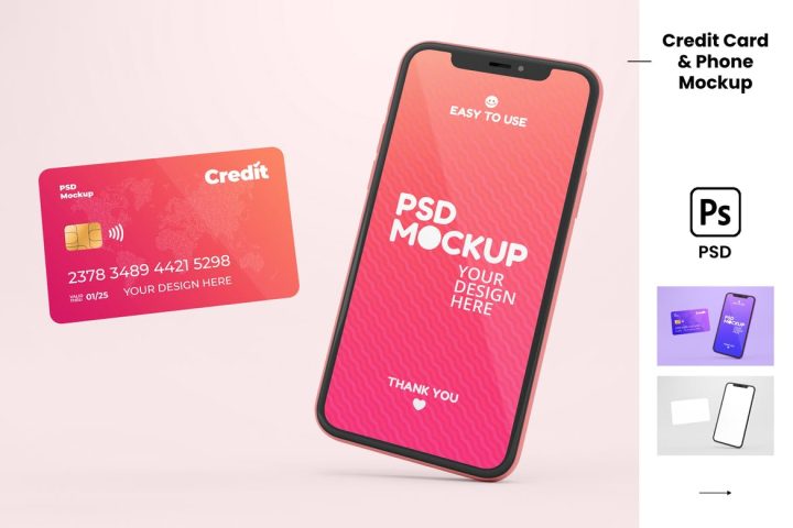 Realistic, clean and easy to use Credit Card + Phone Mockup presentation.