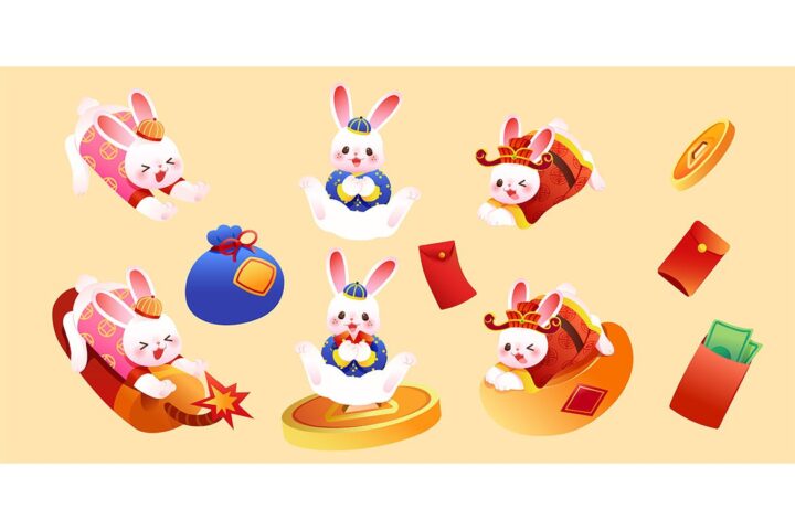 Cute CNY bunny element set isolated on beige background. Illustrated rabbits in traditional costumes, firecracker, fortune bag, red envelopes, coins, and gold ingot.