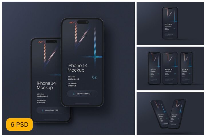 Fresh, new Mockup set for IOS UI/UX designers. This set features a professional Dark iPhone 14 Pro smartphone model, changeable colors of all elements, and changeable background. Set your app apart in the crowded app marketplace with enticing images bound to attract customers.