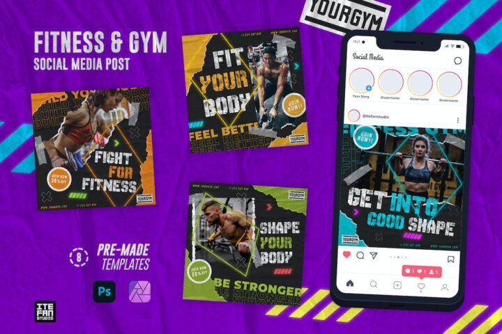 Fitness & GYM Social Media Post included 8 pre-made templates design for social media post. It’s suitable for promoting Fitness training and GYM room on most of the social media platforms. Easy to customize for your brilliant creations to surprise your audience.