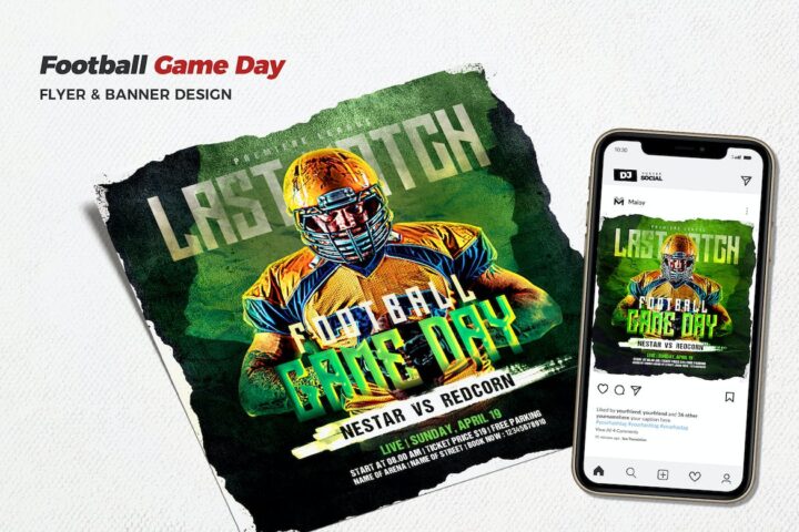 Football Game Day Flyer Creative and modern Instagram template to make your Instagram feed better and stand out. This flyer template perfect for any personal or corporate use. You can easily edit this flyer template. You can change the image with the smart object. You can resize all objects without reducing the image quality.