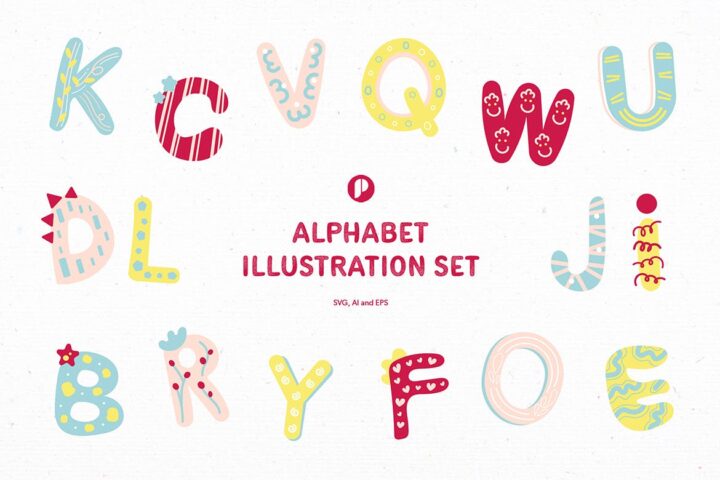 Fun Learning Alphabet Illustration Set consists of 26 illustrations, available in three different format files, AI, SVG, and EPS. You can use it on your graphic project using the suitable and comfortable application you usually use. You can duplicate as many as you want or resize the item as small or as big as you need. This illustration set is very easy to use, and you will not have any major difficulties when using it.