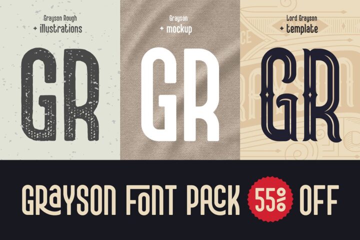 Presenting a font set that includes 3 typefaces from Grayson family with 55% OFF. All of this fonts have the same shape, but with different styles and effects. Grayson Regular is a straight grotesque, Lord Grayson have a classic decorative style and Grayson Rough has a grunge textured effect. Also lots of bonus graphics is included such as label template, mockup and vector illustrations.