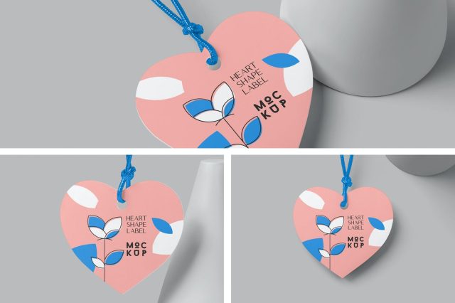 Get these awesome PSD files of heart shaped label mockups where you can insert your fashion apparel branding designs, logos, gift tags and other tag branding designs. This label mockup set is super easy to customize. Paste your designs using smart object layer, customize effects and background using well-named layers and your designs are ready to impress your clients.