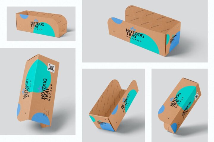 Presenting hot dog packaging tray mockups made of paper material to present your fast food packaging and branding designs. You can customize the inner and outer side of the tray box with the help of smart object option. All 5 mockups also have well-organized layers for the adjustment of shadows, effects and background.