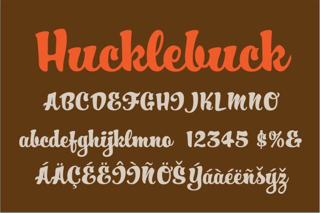 Hucklebuck is a retro, upright script font that is immensely appealing with its happy–go–lucky feel. Done in the style of hand painted sign lettering, the font was inspired by some window lettering on an old store near where I live. Hucklebuck was a pet name my mother used to call me when I was little (it’s actually a kind of dance).