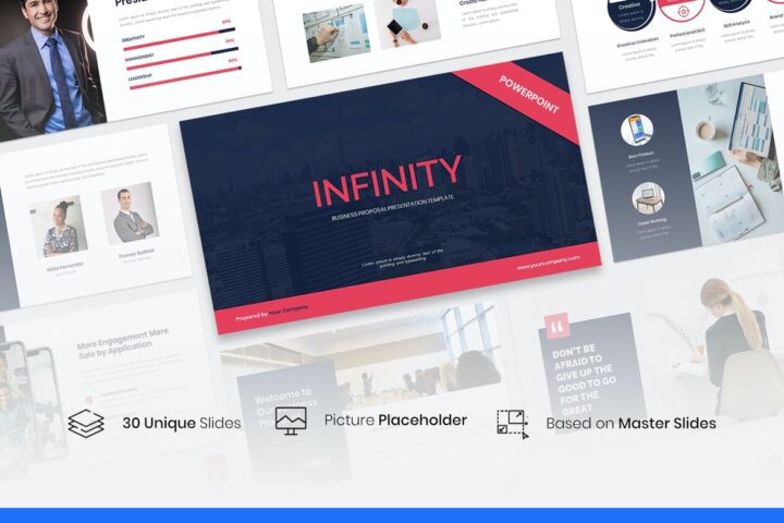 Infinity PowerPoint template is a perfect way to present your business proposals and win your audience over. The template is designed to be modern, clean, and professional. With a focus on the big picture, we have created a stunning theme that will engage your viewers. This Presentation can be used for any type of presentation: Portfolio, Company Profile, Multipurpose, Creative Agency, and also can be used for Custom Production. There are 30 unique, creative and modern slides. Easy to change colors, modify shapes, text & charts. All shapes are editable. All pictures in the presentation can easily be inserted in just one click.