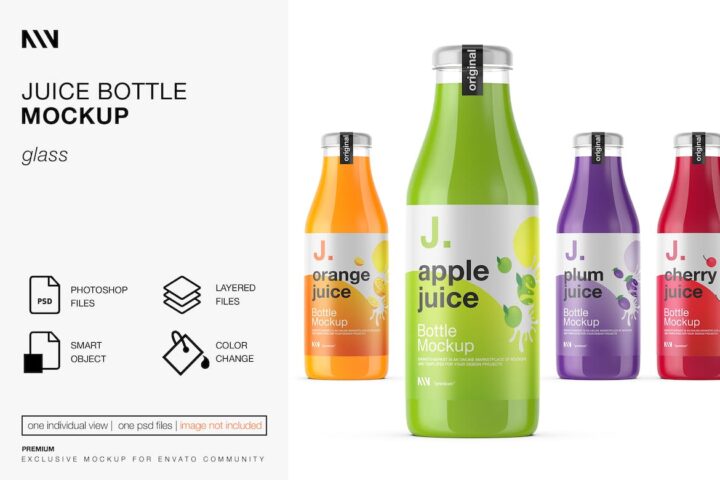 Present your design with this “Juice Bottle” Mockup befrore printing. The file includes seperate layers for the color objects and background. Smart layer for the label helps to apply your design. Premium quality and simle to use.