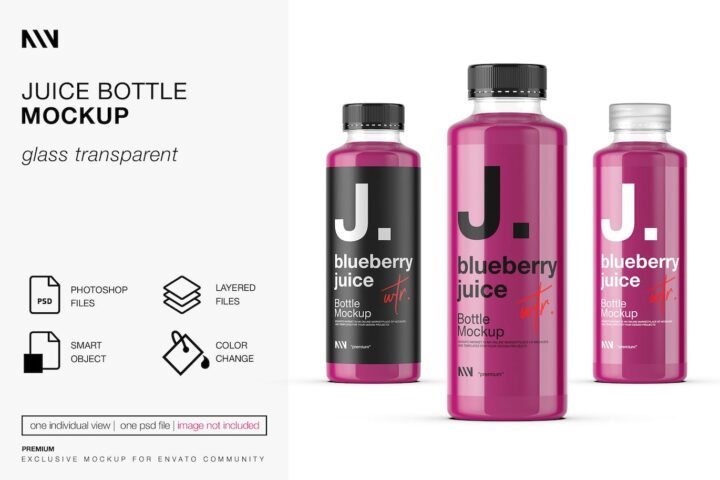 Present your design with this “Juice Bottle” Mockup (blueberry) befrore printing. The file includes seperate layers for the color objects and background. Smart layer for the label helps to apply your design. Premium quality and simle to use.