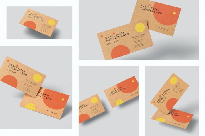 These high-quality kraft paper business card mockups will depict how your business card will look when it gets printed on brown paper. These visiting card mockups captured with 5 different angles and arrangements. You can easily add your design to these mockups using smart object option. You can also customize the light effects, shadows and background of these mockups using well-named layers.