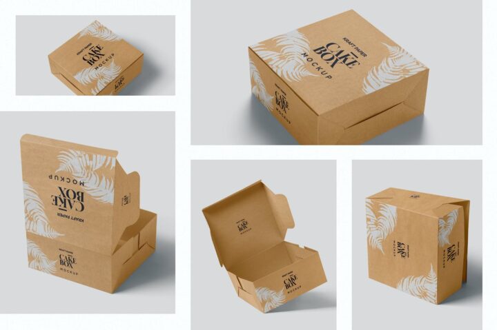 Have these kraft paper cake box mockups to showcase your bakery branding and packaging designs on the inner and outer side of the cake packaging box. All visible sides of the box have separate smart object option so you can customize each side of the box with your choice. You can also personalize light effect, shadows and background of these mockups using intelligent layers.