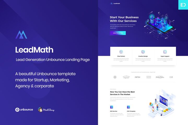 LeadMath is a clean and modern Unbounce Template with focus on conversion, it can be used to promote your services, or even in any lead gen or click-through campaign. Source PSD’s are included for easy edition and customization. We hope you like it!